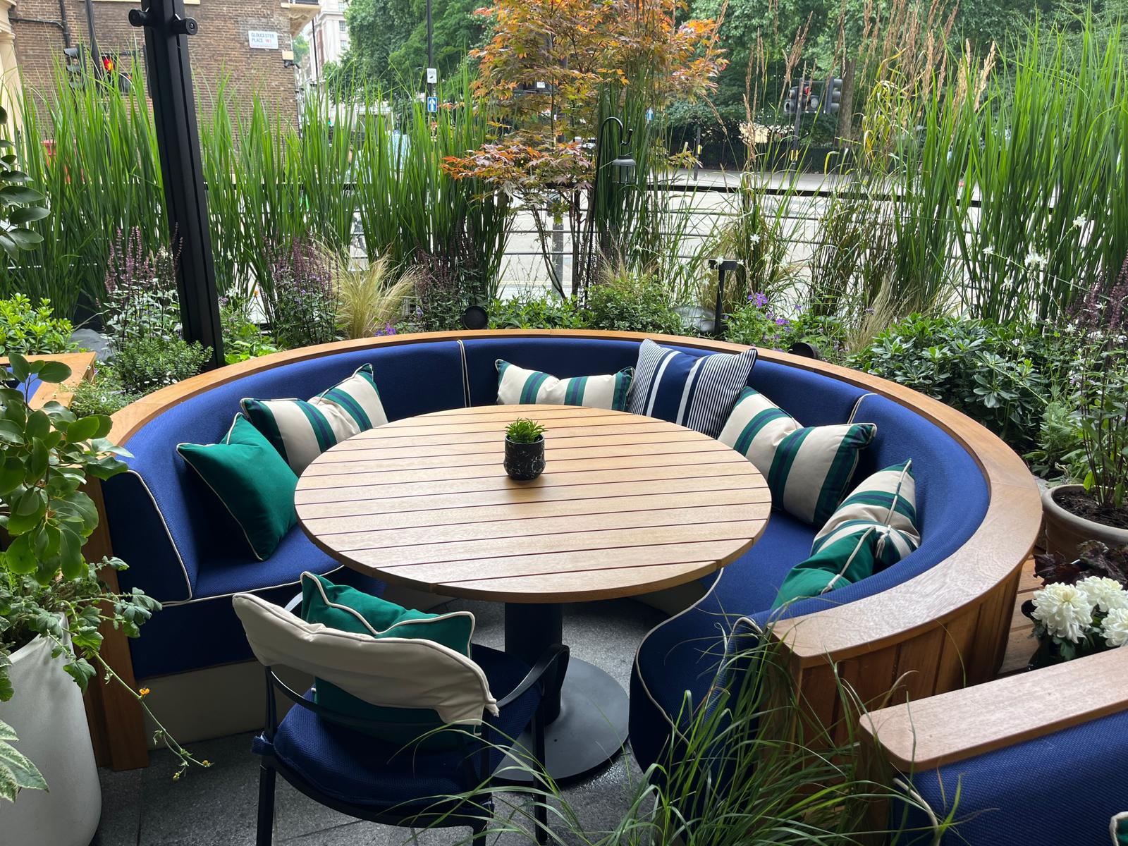 In addition, we supplied poser-height tables and stools, bespoke tabletops, and replacement bases where required. To complete the transformation, custom planters and trellises added the perfect finishing touch, bringing a refined garden-like feel to this unique retreat.